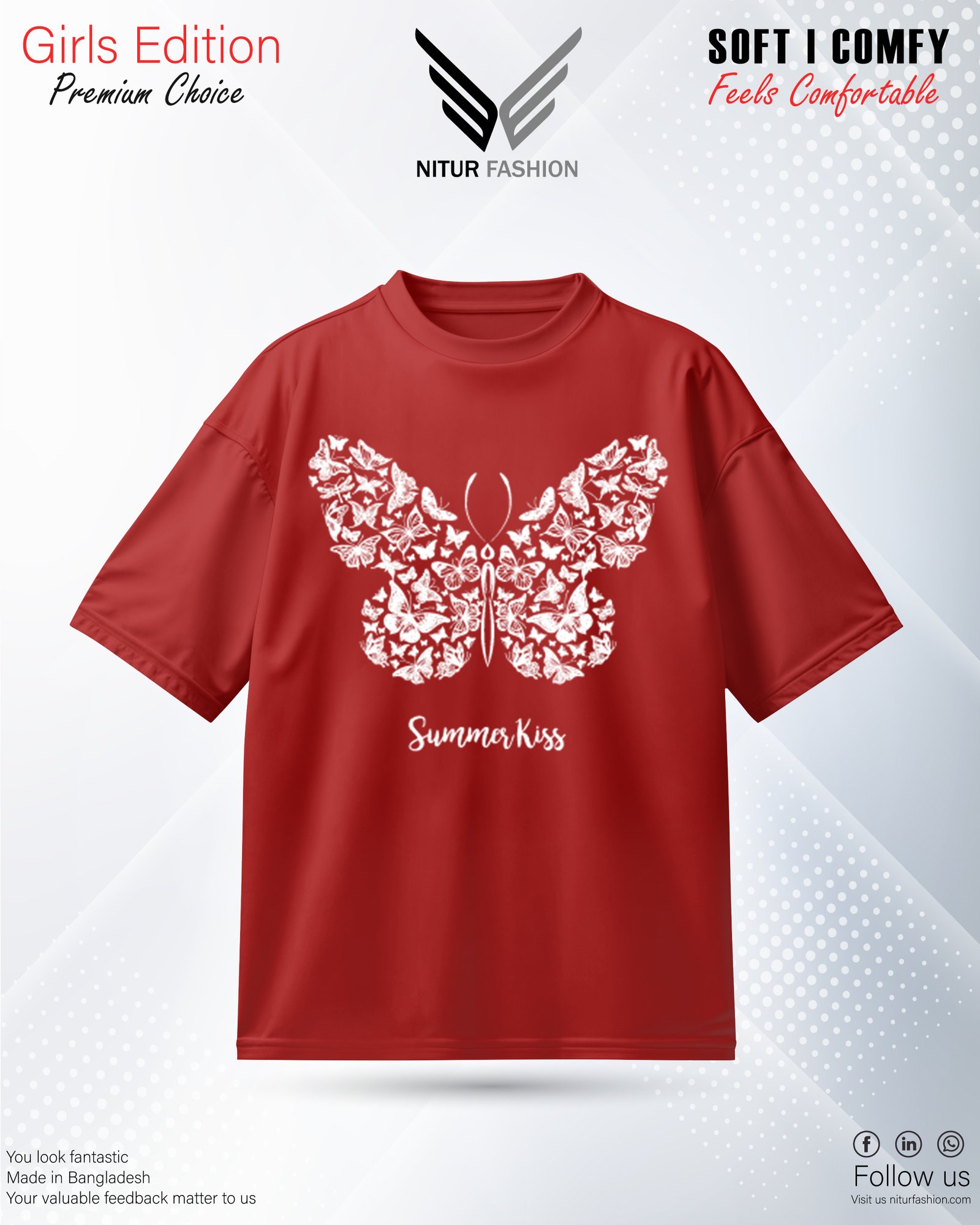 The Nitur Fashion Girls’s Premium Tee delivers a soft, silky-smooth feel with a well-structured, mid-weight fit. Crafted from high-grade Combed Compact Cotton, this tee boasts an impressive ~175 GSM using 26’s cotton, ensuring a refined and compact weave. Its compact finish helps maintain the original length and width, even after repeated washes and long-term wear.
